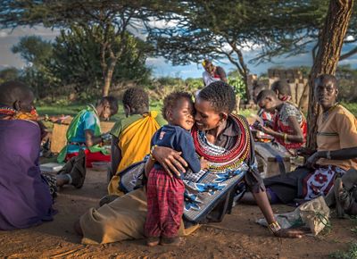 Ntipiyon Nonguta and her son Bernard relax with their neighbors as they make beaded belts for Loisaba Community Trust in northern Kenya to be sold to international markets.