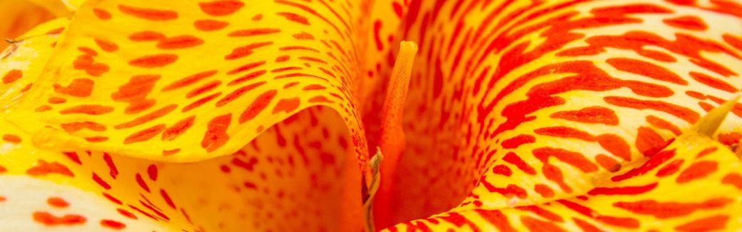 Close up of a red and yellow speckled flower.